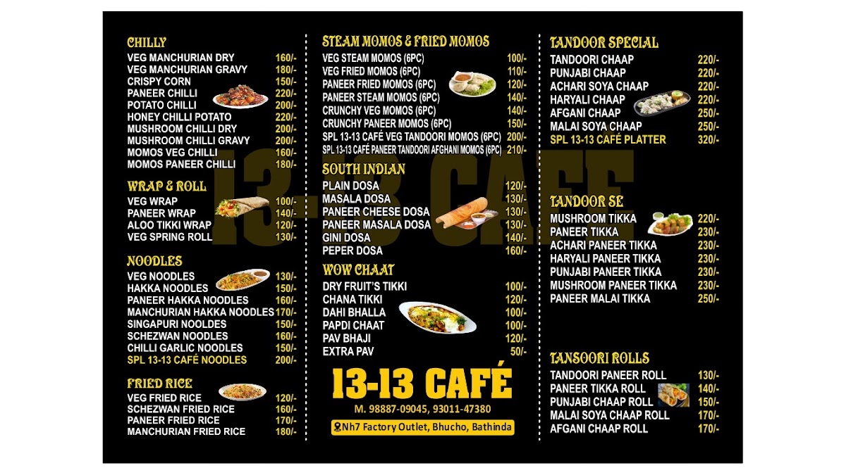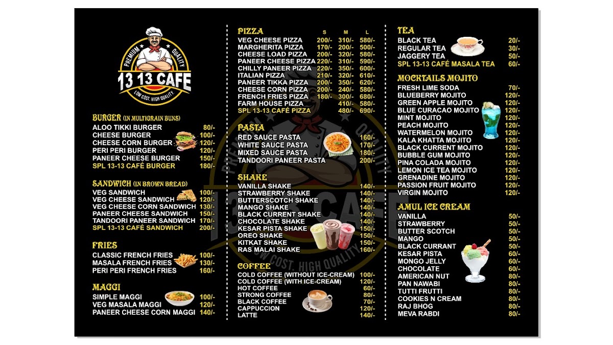 Welcome to 13 13 CAFE, a hidden gem located in the bustling heart of Bhucho Mandi, Punjab. This delightful café offers a mouthwatering menu that showcases an impressive range of shakes and delectable offerings that promise to satisfy every palate.